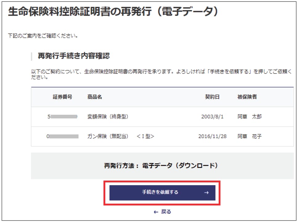 それぞれのお手続きを選択するとそのままお手続きに進むことができます。依頼受付後は、「生命保険料控除証明書」をご登録住所またはご指定の住所宛に郵送いたします。