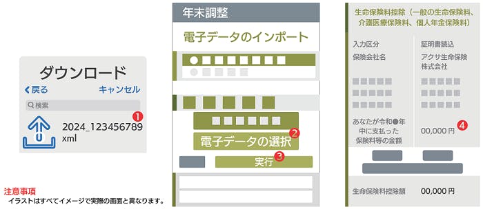 STEP5でダウンロードしたXML ファイルは、年末調整(年末調整ソフト)や確定申告(e-Tax)で電子提出する際に、各項目の電子データを選択する項目でインポートすることで、生命保険料控除証明書の内容が自動入力されます。
