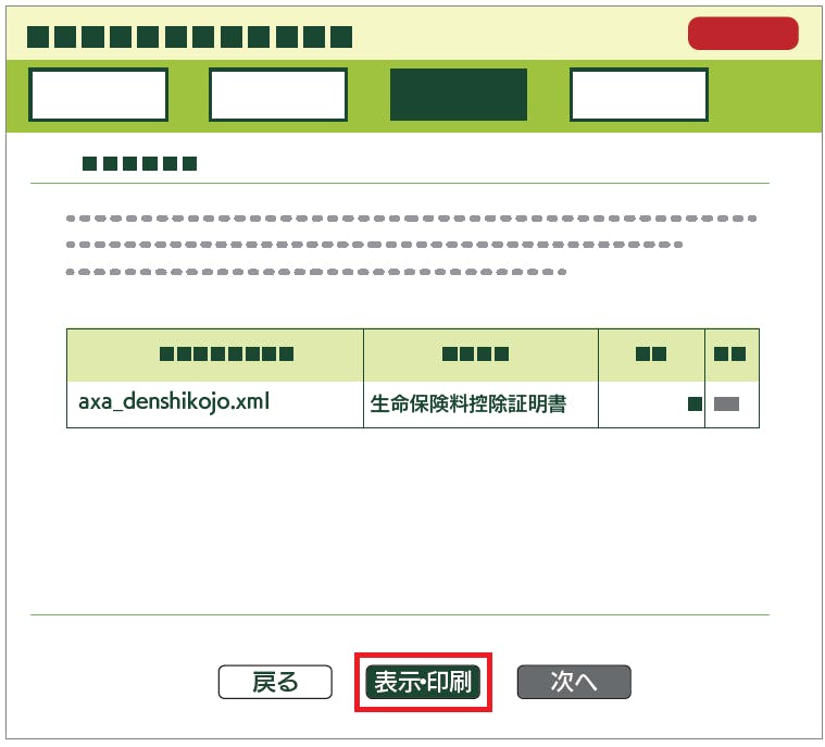 帳票名称の画面に「生命保険料控除証明書」の表示 がされたら、「表示・印刷」のボタンを押してください。
