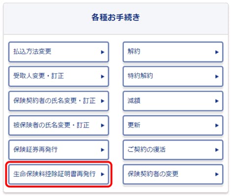 STEP 1. 「生命保険料控除証明書再発行」を選択